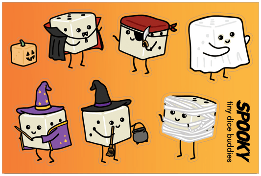 Spooky Tiny Dice Buddies Die-Cut Sticker Sheet (Set of 7 Stickers)