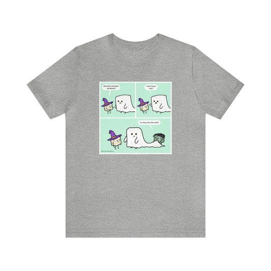 Tiny Dice Buddies "Why Don't Monsters Eat Ghosts" Punny Joke | Unisex Jersey Short Sleeve Tee