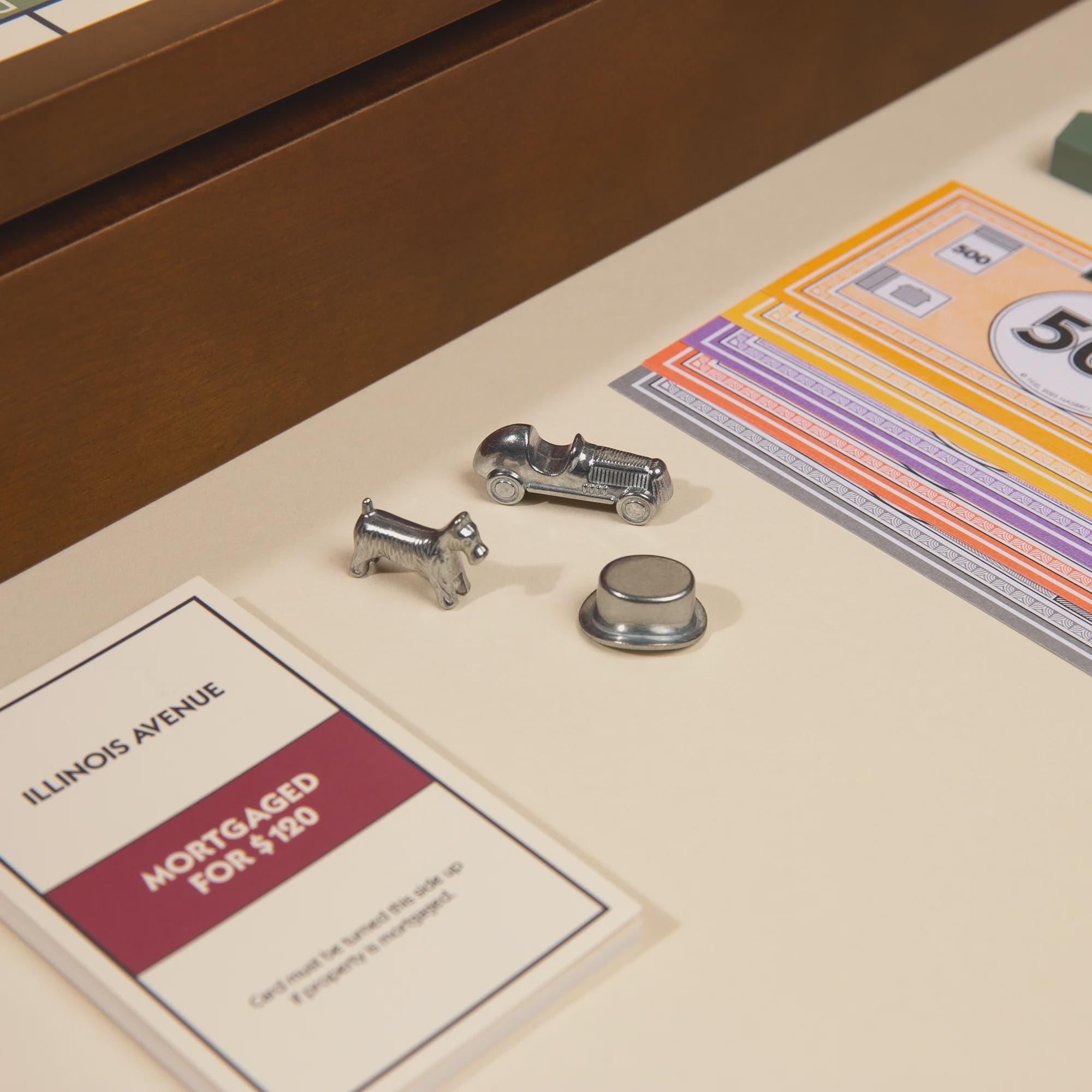 1. Monopoly: Game board with solid wood rolling frame, 6 die-cast metal tokens, 32 wood houses, 12 wood hotels, 16 Chance cards, 16 Community Chest cards, 28 Title Deed cards, 1 pack of MONOPOLY money, 2 dice, and instructions.