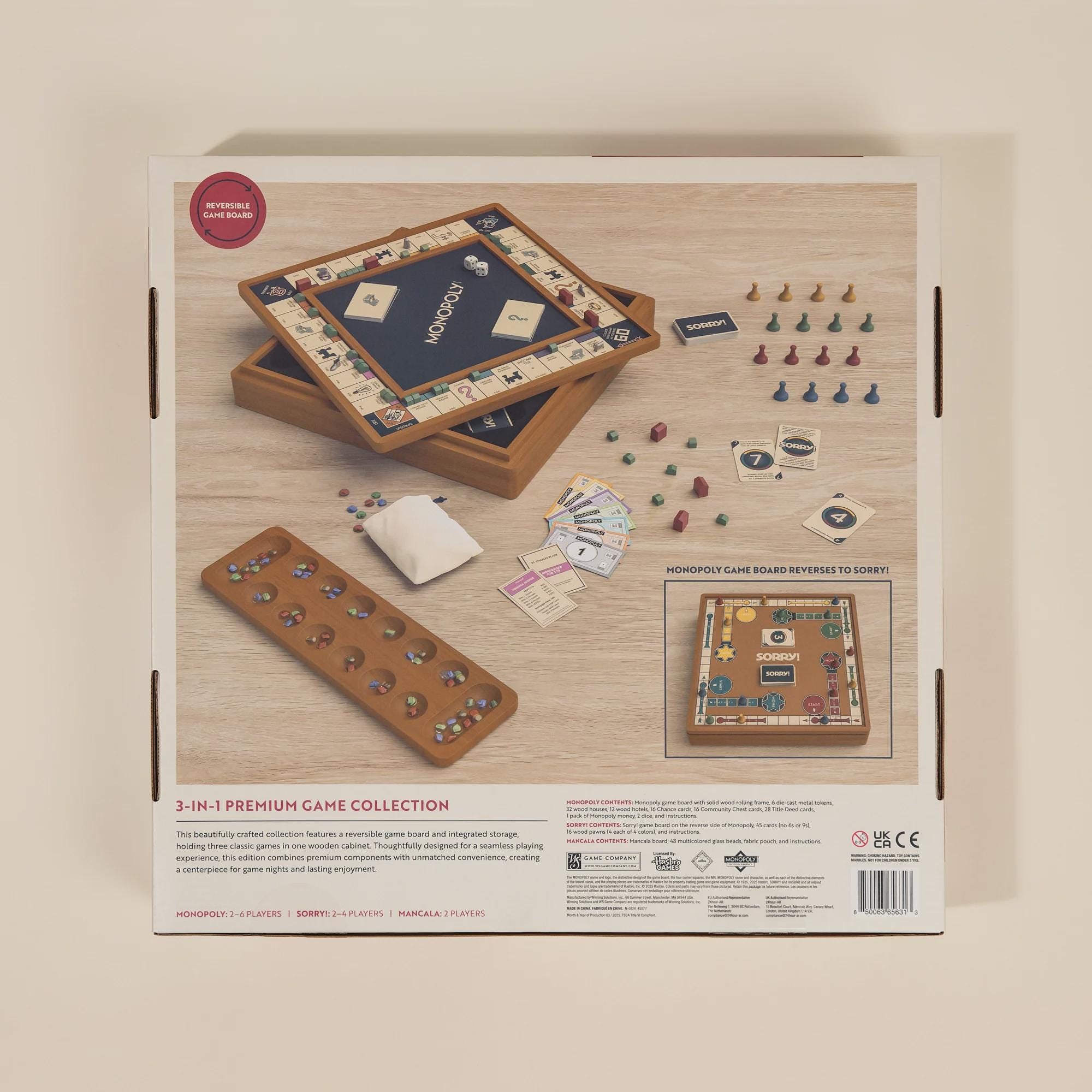 • 3-in-1 Premium Wooden Board Game Set: Monopoly, Sorry, Mancala